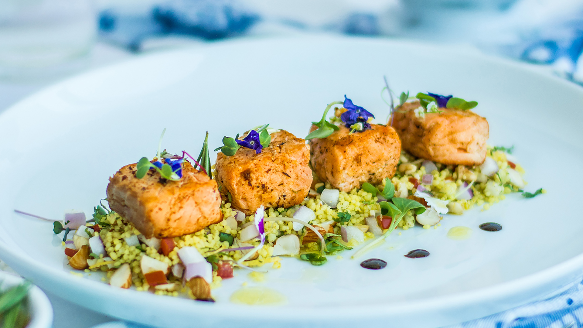 Para el salmón: En un sartén caliente agregar 4 cubos de salmón y cocinar por todas sus caras durante 2 minutos, luego agregar cilantro sal y pimienta.